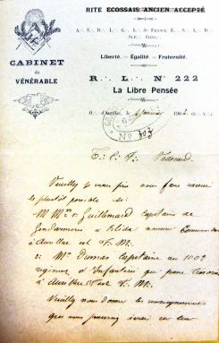 Le Trésorier de « La Libre Pensée » adresse au Grand Orient de France un chèque de 215,25francs, montant de la cotisation de l’année 1905 et d’un arriéré de 1904. Le 10 janvier 1907, son Vénérable, le Frère Baudel écrit à l’obédience pour indiquer que la Loge traverse une période pénible : l’affaire des fiches a causé des frais et a entraîné un important absentéisme ; de plus la présentation de comptes fictifs par le Frère Trésorier et les détournements qu’il a fait viennent aggraver les difficulté de la Loge. Il conclut en disant que « C’est par des prodiges de prudence que nous maintenons quand même le bon renom et le prestige de la Loge. Nous mettre en sommeil réglementairement serait la fin de toute action et nos adversaires s’en serviraient tôt ou tard pour proclamer la mort de la Maçonnerie dans notre département... »