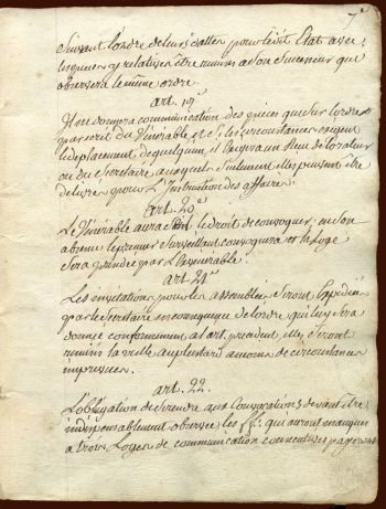 Il ne donnera communication des pièces que sur l'ordre par écrit du Vénérable et si les circonstances exigent le déplacement de quelqu'un, il exigera un reçu de l'Orateur ou du Secrétaire auxquels seulement elles peuvent être délivrées pour l'instruction des affaires.